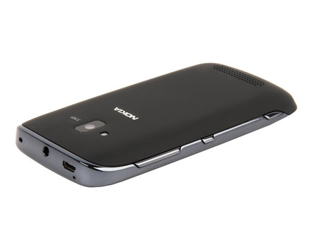El terminal tiene el botón de encendido en el lateral, como en su hermano mayor el Lumia 800. Los botones son fijos, no se quitan cuando extraes la tapa de la batería al quitar esta ultima, como nos podemos encontrar en su hermano de gama el Lumia 710, nos encontramos con una batería de 1400Mah y una ranura para una Micro SIM, también encontramos la membrana del altavoz, aunque tenga un diseño muy actual, no deja de ser un low cost de una buena marca y eso se hace notar.