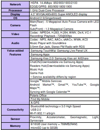 Este modelo viene a ser la gama media de samsung, dispone de un procesador de doble-núcleo a 1Ghz, pantalla Super AMOLED de 4 Pulgadas, una camara de fotos de 5Mp y con flas led, con una batería de 1500 mAh.