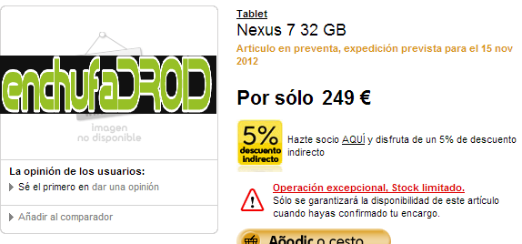 Ahora nos llega una nueva noticia, y es que una cadena de electrodomesticos bastante grande ha colgado información para su reserva de la tableta de Google con 32GB de capacidad, esto no sería noticia si no fuera que el precio al que va a salir será el mismo al que salió la versión de 16GB, quedandose esta en 199€.